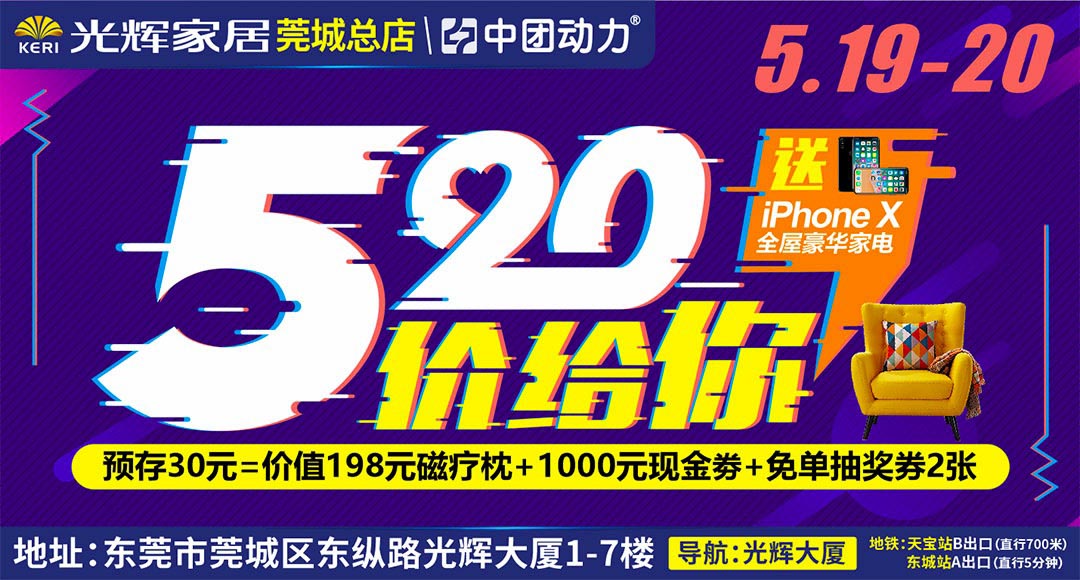 【家具卖场】5月19-20日光辉家居(莞城总店)“520价给你”家具工厂团购,进店免费领豪礼下单抽免单iPhone X